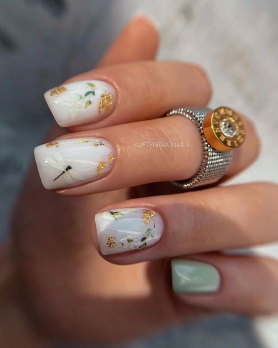 The sheer elegance of white square nails is elevated with the addition of subtle gold flakes, creating a look of refined luxury. These medium length nails are a fit for any summer event, blending simple sophistication with a touch of glamour. It’s a trendy short style that provides a canvas for those who love a minimalist aesthetic with a hint of shine.