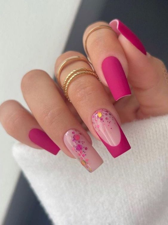 Step into the vibrant energy of summer with these long square nails. A bold fuchsia takes center stage, providing a bright and colourful backdrop for the artistic splashes of glitter and paint-like strokes on the accent nails. It’s a creative ensemble that celebrates the fusion of pink hues and spontaneous nail art designs, perfect for the fashionista looking to make a trendy statement at any summer festivity.