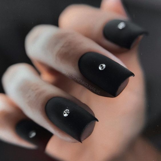 Elegance meets edge in this black matte finish on long square nails. Each nail is a canvas for a single, sparkling gem, adding just the right amount of glamour to the simple sophistication of the design. This style is for the woman who commands a room with her medium yet impactful presence, a true embodiment of inspo for those who believe that less is more.