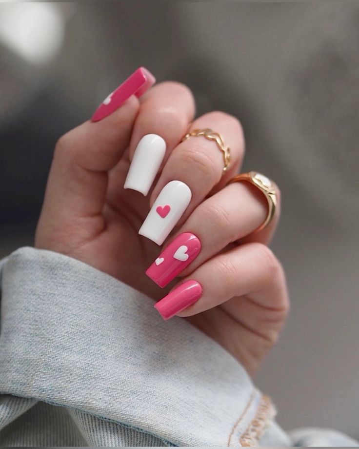 Here’s to the romantics, the sweethearts of summer. These medium length square nails alternate between a soft white and a playful pink, each adorned with a charming heart. This design is a cute and simple short option for those spontaneous summer dates or weekend brunches with friends, an absolute go-to for a pretty and personable expression.