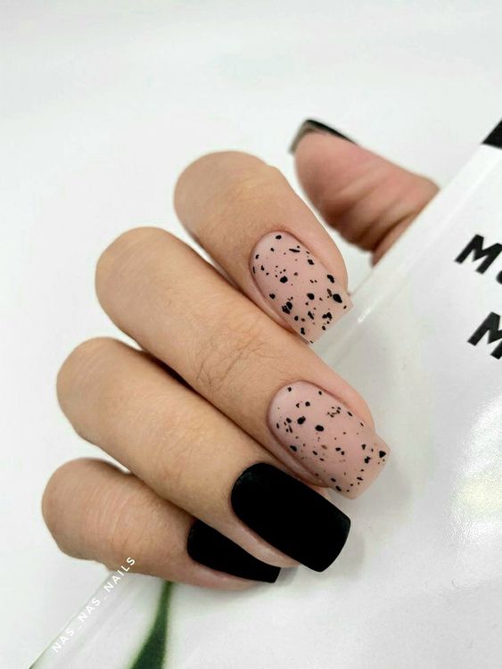 These short square nails are a canvas for understated elegance. The nude base with black speckles offers a contemporary twist on the classic, creating a simple short look that’s both trendy and cute. This design is for the woman who thrives on the details that make life unique, perfect for both a day at the office or a casual weekend brunch.