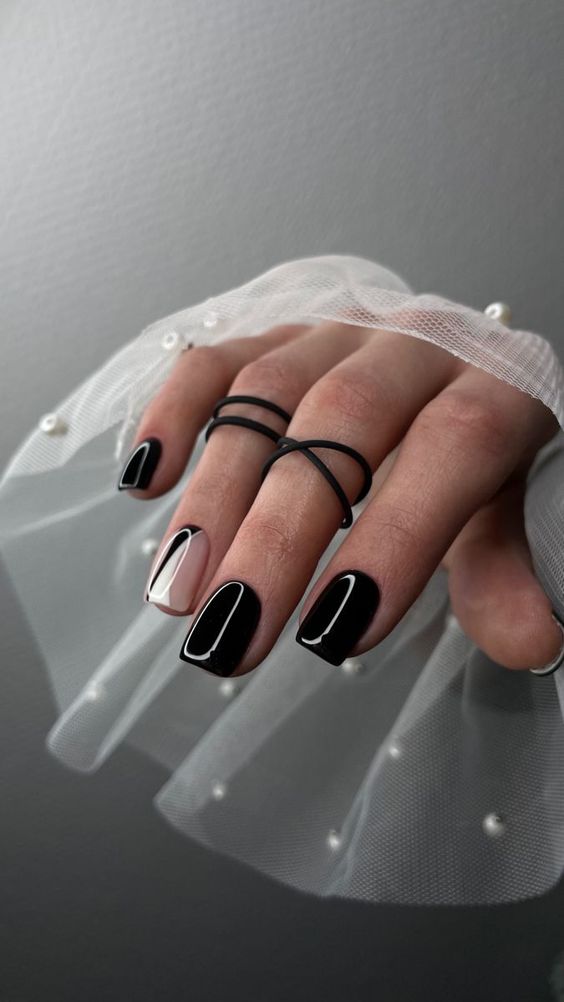 These long square nails make a statement with their bold black and white contrast. The clean lines and sharp color differentiation offer a modern take on the monochrome trend, presenting a trendy short yet impactful visual statement. This design is for the woman who embraces bold contrasts and isn’t afraid to stand out.