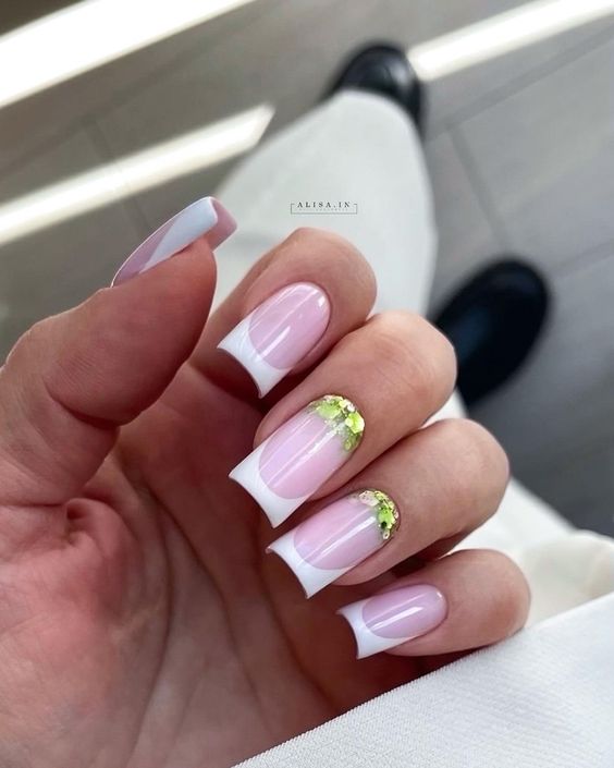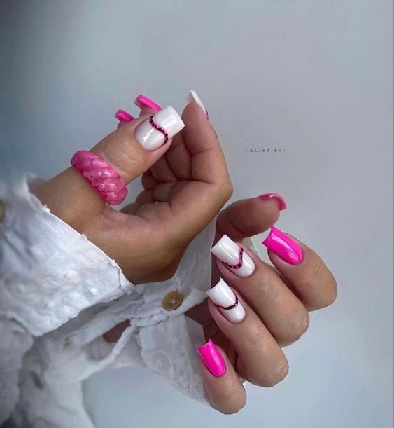 Marrying the timeless elegance of white with a touch of sassy pink, these medium length nails present a harmonious blend of simple and cute. The nails feature a French tip design that’s been modernized with a pink twist, speaking to the classic French aesthetics while the added rounded pink accents give a small, playful nod to contemporary artistry. This design is a perfect fit for the woman who treasures a classic look with a hint of whimsy.