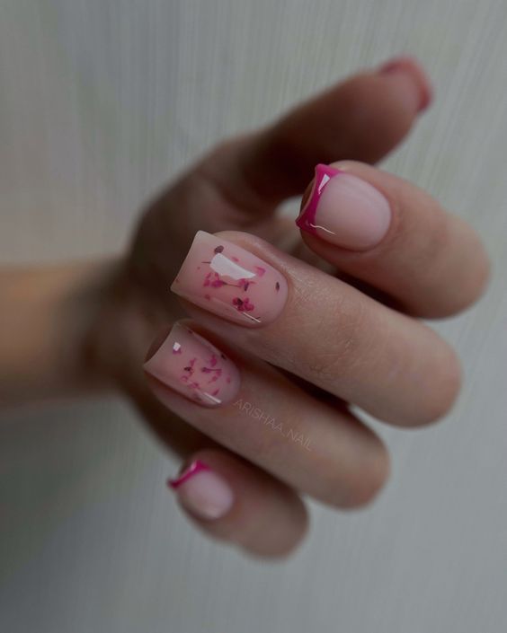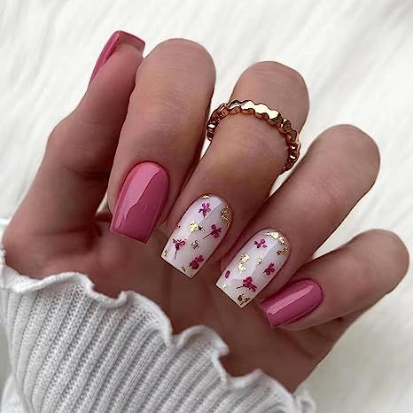 Embrace the gentle side of summer with these medium square nails, featuring a translucent pink base sprinkled with tiny floral embellishments. They are a testament to the simple short nail trend, while still incorporating a touch of playful nail art designs. Perfect for adding a dash of pretty to your everyday look.