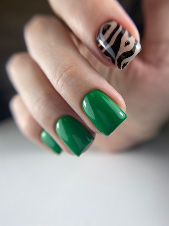 Here we see a fascinating interplay of medium tapered square nails coated in a lush green. The standout feature is the singular nail adorned with a black and white zebra pattern, infusing an element of the wild into an otherwise simple palette. This look is for the bold at heart, those who carry a piece of nature’s unpredictability with them. The nail art designs exhibit a love for the earth’s organic patterns, interpreted in a chic, urban manner.