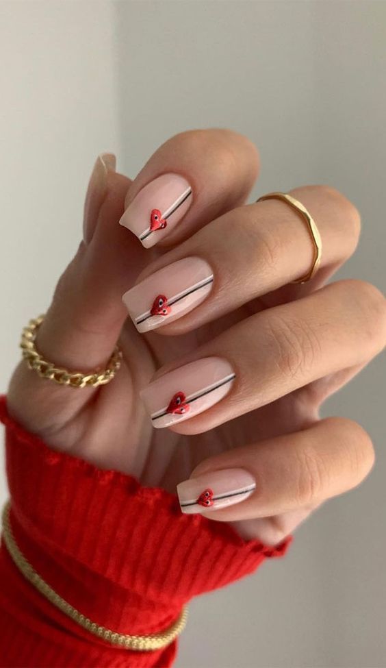 For the minimalist with a love for understated beauty, these short tapered square nails in a soft pink breathe life into the concept of simple short designs. Accented with a single red heart on each ring finger, they offer a whisper of romance, perfect for a subtle yet pretty statement. This design resonates with those who find beauty in simplicity, with just a dash of passion represented by the red accents.