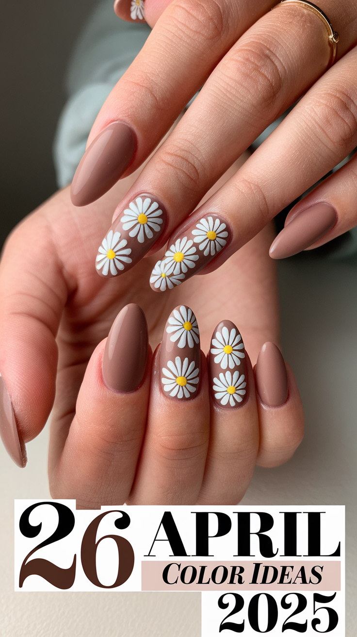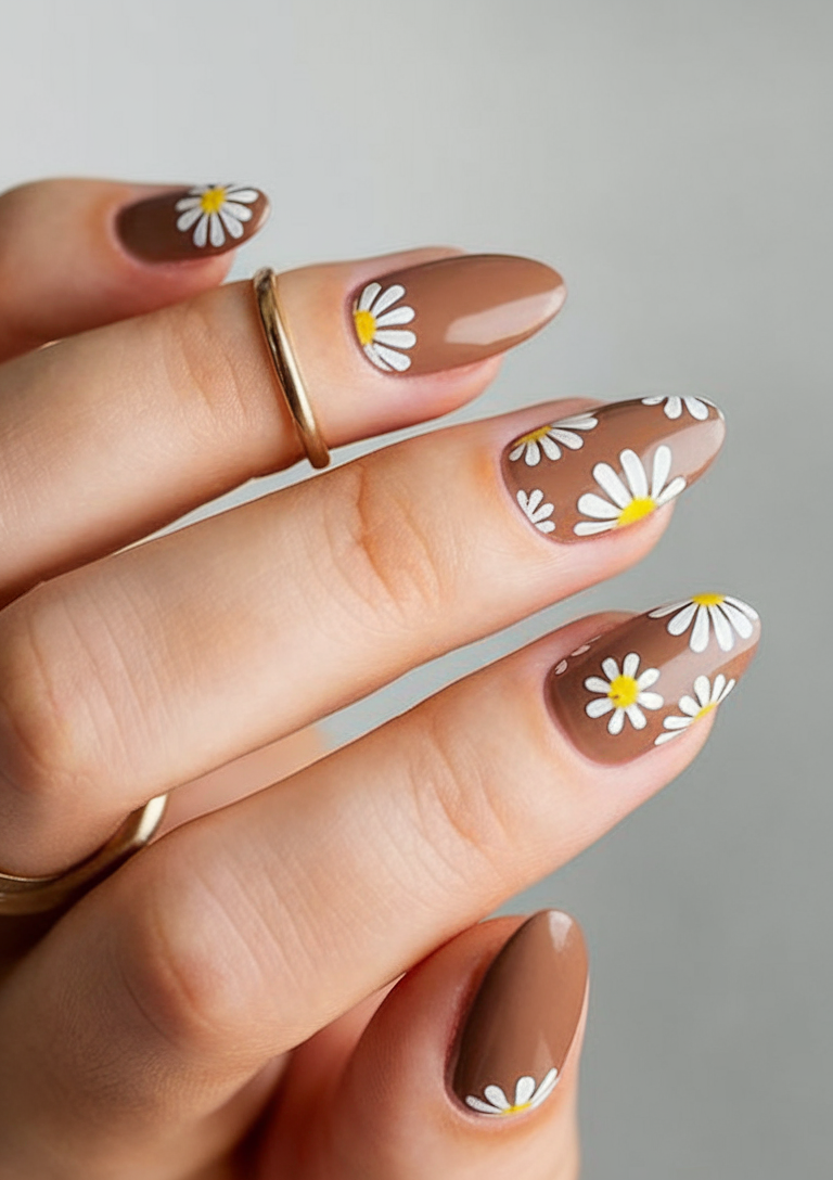 This dark-colored manicure embraces a warm brown solid gel base, enhanced with delicate white daisies. The almond shape keeps the look modern, while the floral details add a spring freshness. A great gel design for those who love a natural yet stylish manicure.