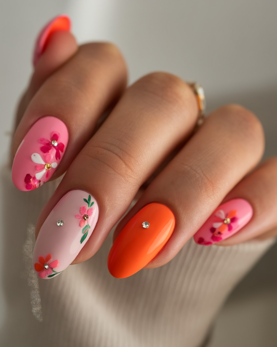 This fun and colorful design blends solid gel with delicate floral accents for a spring-summer aesthetic. A mix of pastel pink and bright orange creates a fresh contrast, while tiny rhinestones add elegance. The almond shape enhances the gel design, making it perfect for both casual and special occasions.
