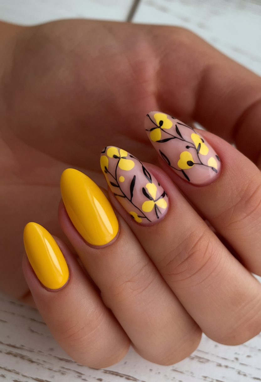 This bright and fun manicure combines a solid gel yellow with a delicate floral pattern. The contrast between the light-colored base and the black-lined yellow flowers adds an artistic touch. The almond shape enhances the elegance of this gel design, making it a bold choice for spring-summer.