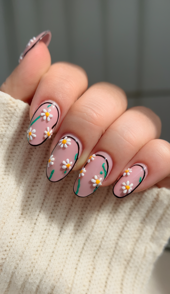 A fresh twist on April nails color ideas 2025, this multi-colored floral design features a soft pink base with intricate white daisies. The thin black outline adds depth and contrast, making the flowers stand out. A perfect blend of neutral and fun, this gel design brings a playful elegance to spring nails.