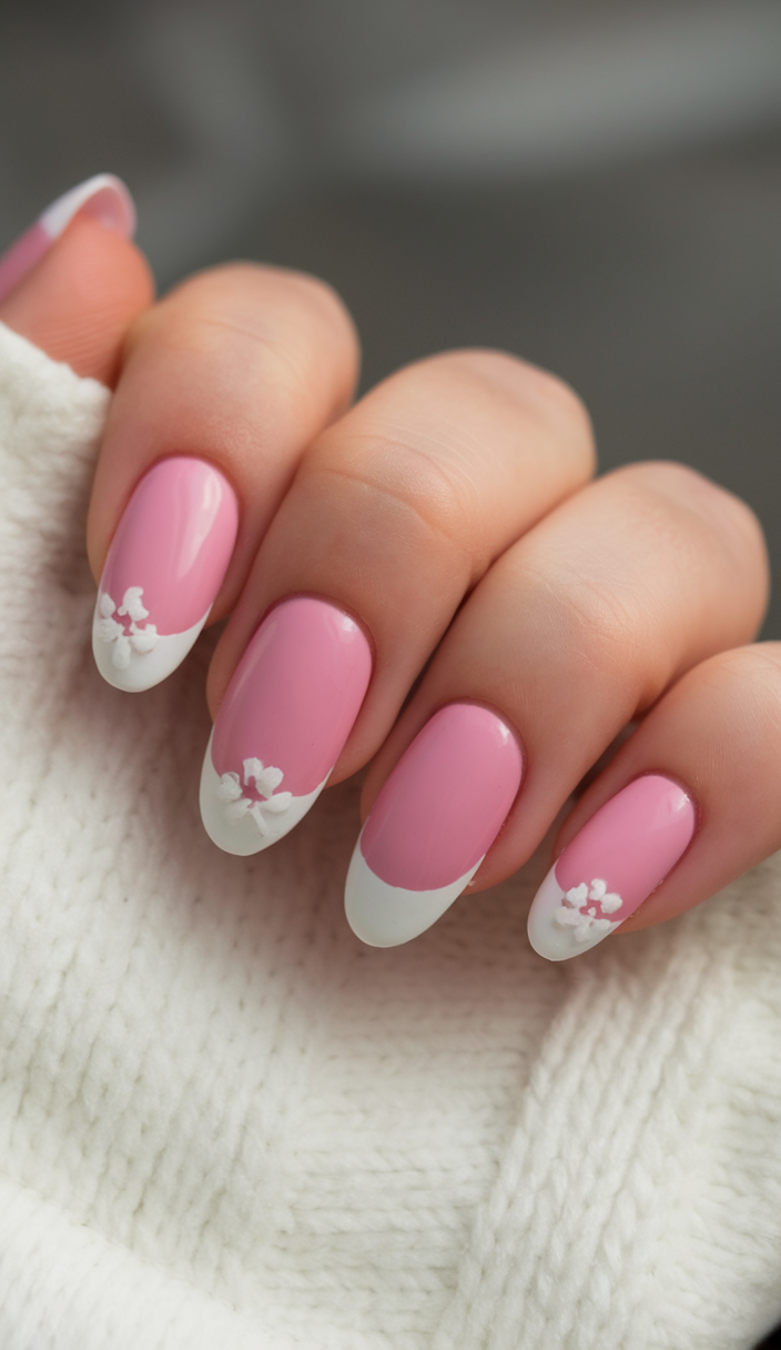 This colored French manicure blends a soft pink base with a crisp white tip for a simple one look. Small 3D white flowers add a touch of elegance, making this gel design perfect for a fresh spring-summer style. The almond shape enhances the natural beauty of the nails while keeping them refined.