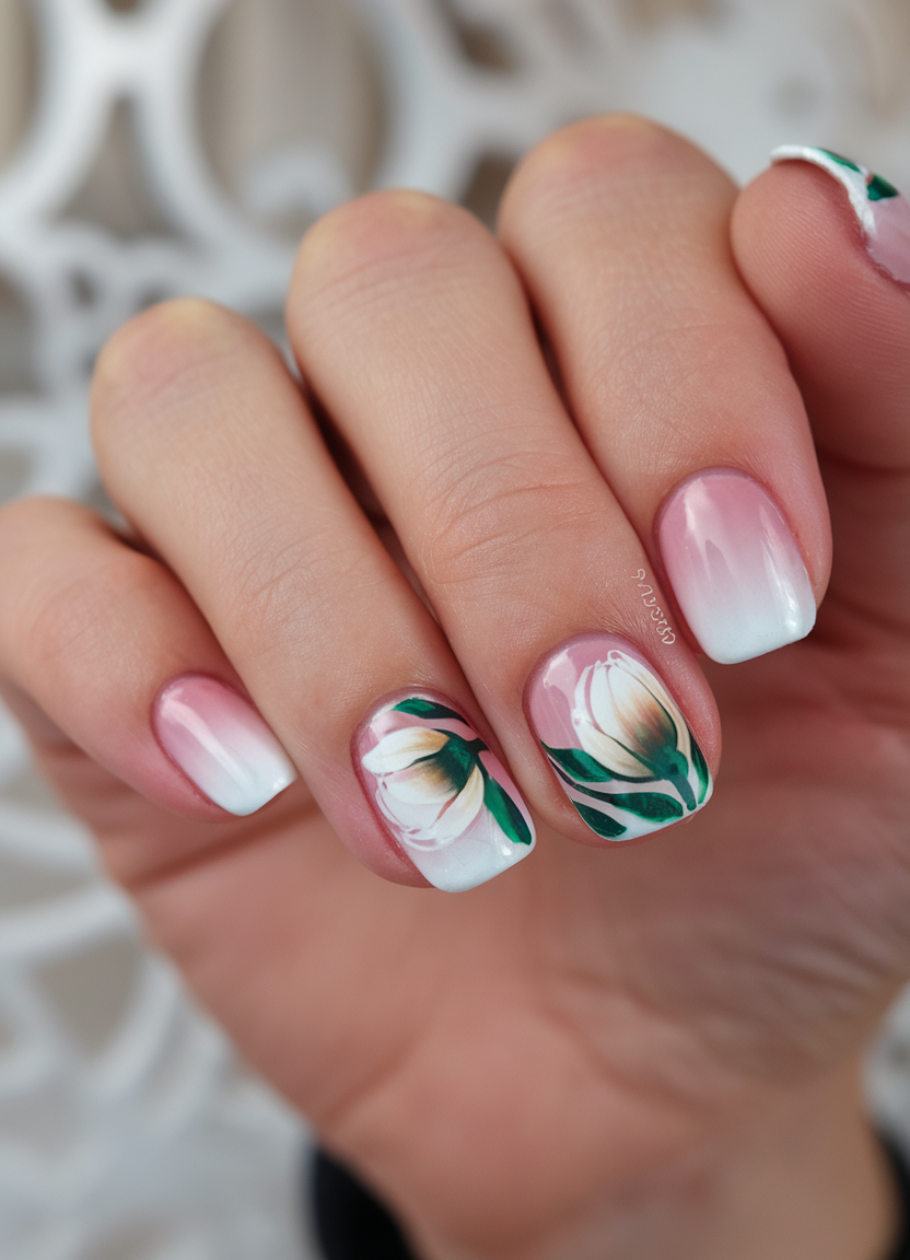 A delicate ombre transition from pink to white creates a neutral and sophisticated look. Hand-painted magnolia flowers bring a full artistic touch to this gel design, making it ideal for those who love a nature-inspired aesthetic. This light-colored manicure is a timeless choice for an elegant yet fun style.