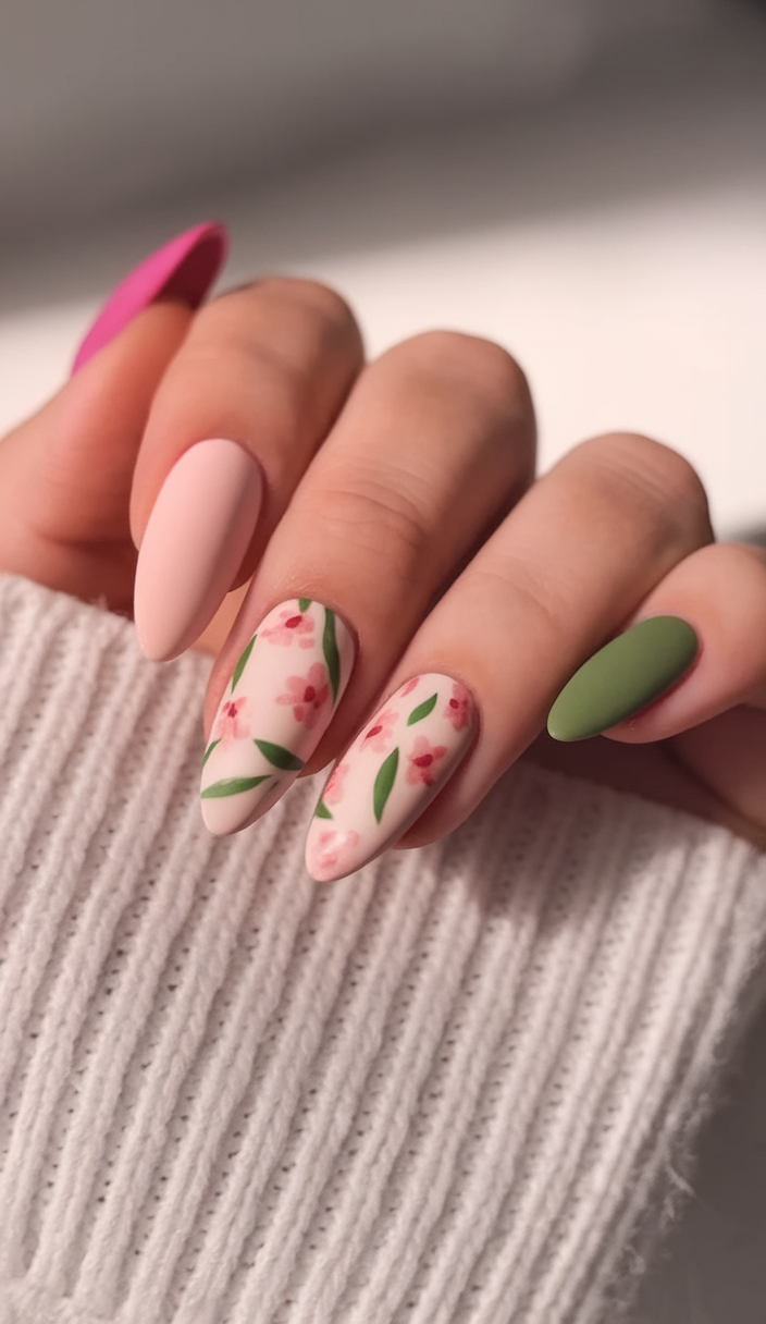 This multi-colored matte design features soft pastel tones of pink, white, and green for a fresh spring feel. The floral art on the accent nails adds a delicate yet artistic touch, while the solid gel green provides contrast. The almond shape and velvety matte finish make this gel design both trendy and stylish.