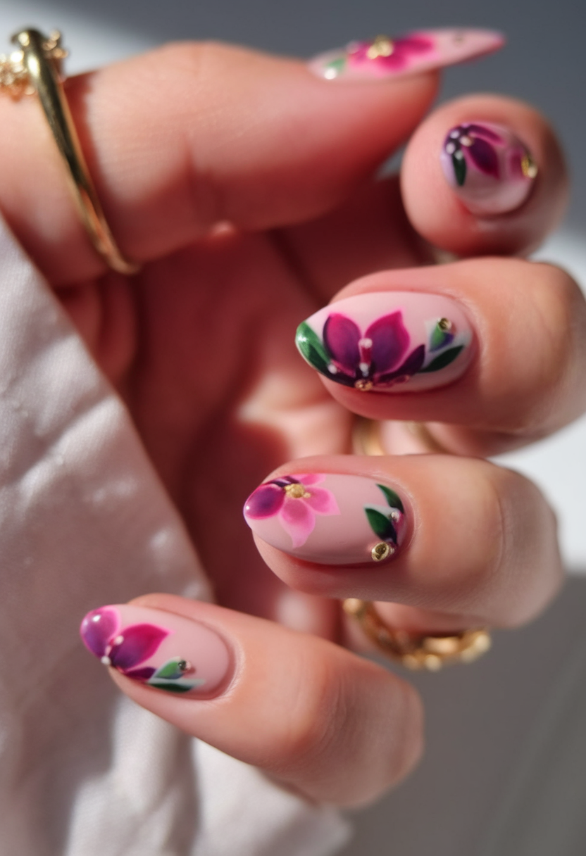 This gel design features a neutral base with rich purple and pink flowers for a luxurious spring-summer look. Small gold embellishments add a refined touch, making this full floral set perfect for special occasions. The almond shape enhances the delicate and artistic appeal of the design.