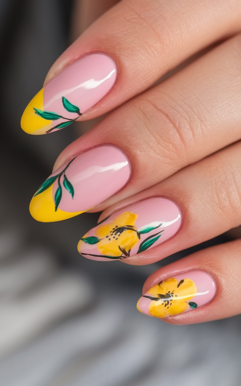 A fresh take on colored French, this light-colored manicure pairs a soft pink base with vibrant yellow tips. The hand-painted flowers and leaves add a fun and organic feel, making it an ideal gel design for those who love nature-inspired nails. The almond shape keeps the look modern and sophisticated.