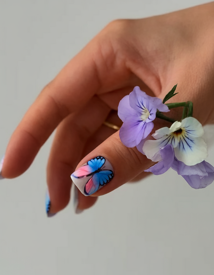 This multi-colored design features a striking butterfly accent on a pastel base, creating a dreamy spring aesthetic. The combination of pink and blue hues makes this gel design feel soft and whimsical. A perfect choice for those looking for a fun and artistic nail look.