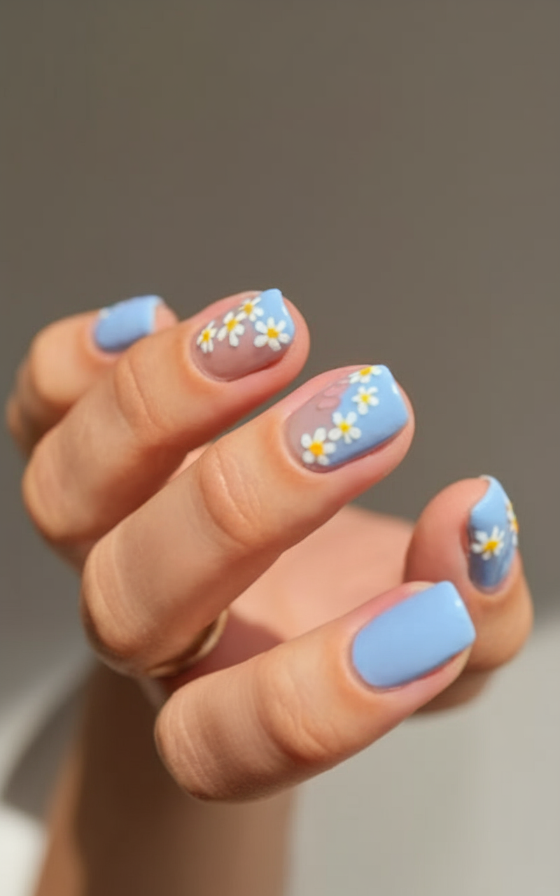 This light-colored manicure blends a soft blue solid gel with delicate daisy accents for a charming spring-summer design. The mix of neutral and fun floral details gives the nails a fresh and youthful appeal. A perfect choice for those who love a simple one yet artistic gel design.