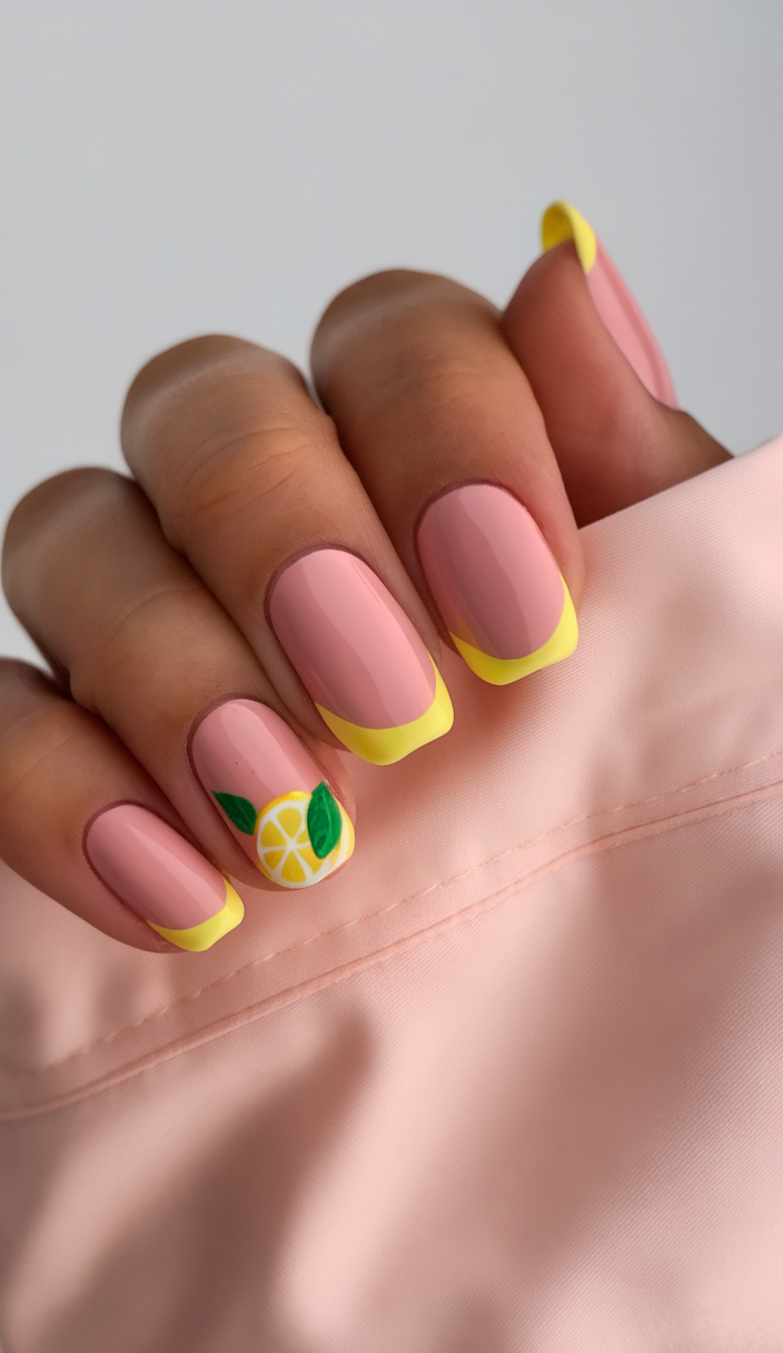 A modern twist on the colored French manicure, this look features a light-colored pink base with a simple yellow tip. The accent nail adds a playful touch with a citrus-inspired design, perfect for a spring-summer refresh. Ideal for those with tan skin, this full set gives a fresh and youthful vibe.