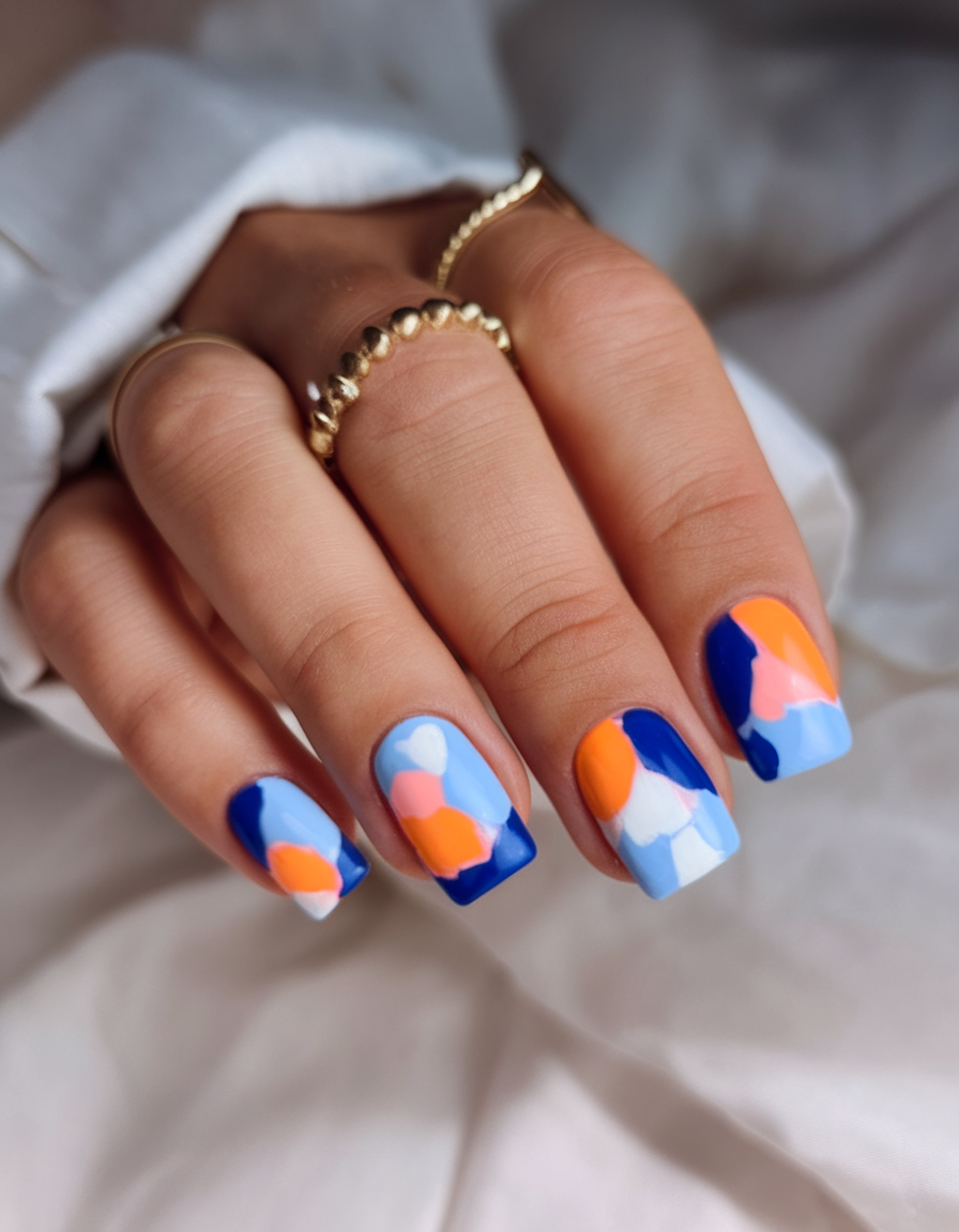 This fun and multi-colored manicure features an abstract mix of blue, orange, and white tones for a bold look. The solid color blocks create a modern and artsy vibe, making this gel design stand out. A great option for those looking to add a touch of creativity to their spring-summer nails.