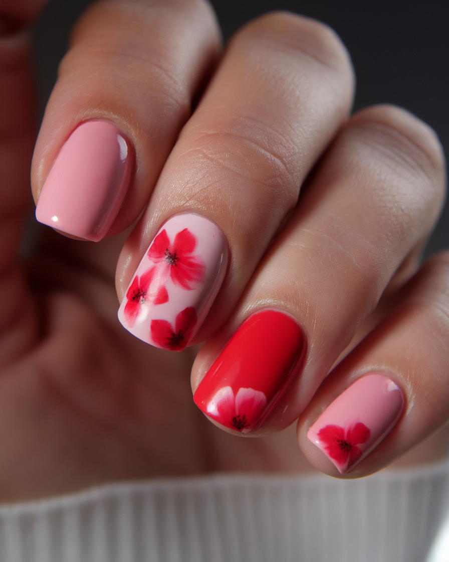 A romantic gel design, this bright and full manicure features a blend of pink and red with hand-painted flowers. The solid gel base adds depth, while the delicate blossoms create a feminine and elegant touch. A timeless spring look that combines softness with boldness.