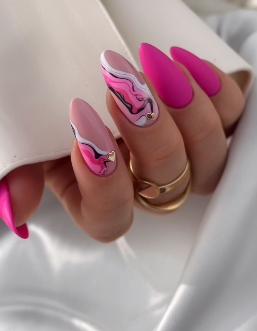 This bright and fun manicure features a mix of solid gel pink and intricate marble swirls. The multi-colored effect blends white, pink, and black in a fluid design, while small gold heart embellishments add charm. The almond shape enhances the elegance, making this gel design perfect for a bold spring-summer look.