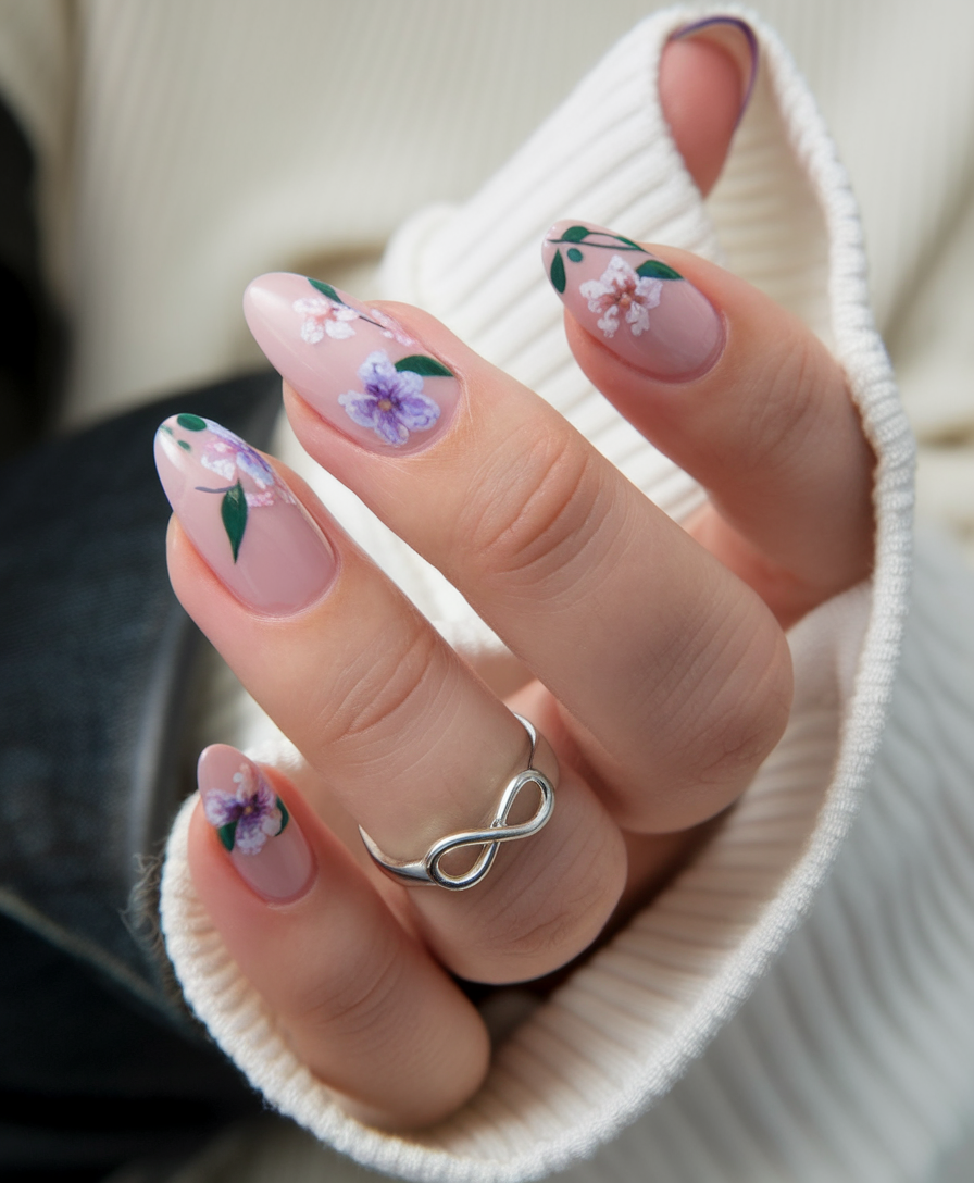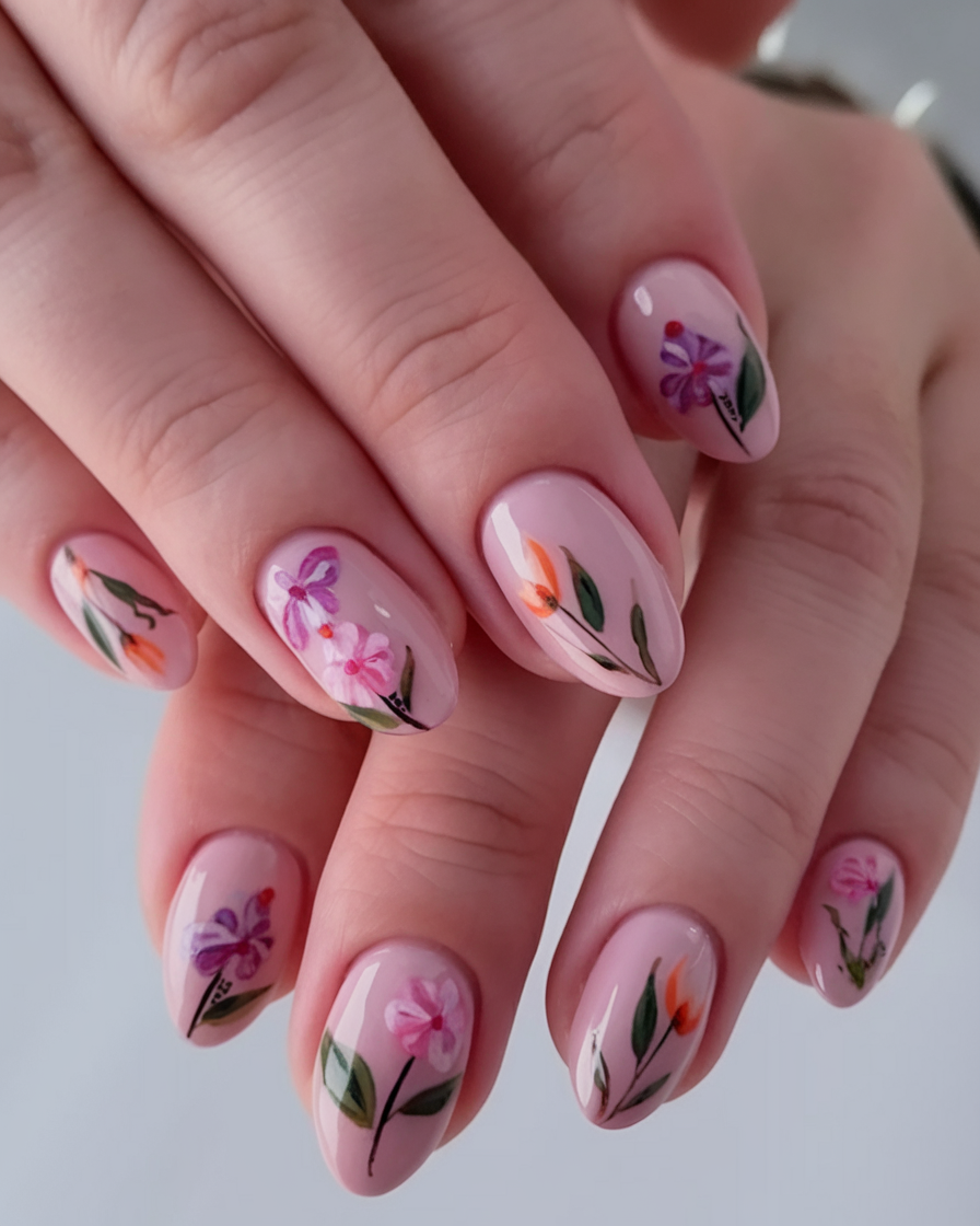 This neutral and pastel manicure features a solid gel pink base with detailed floral hand-painted accents. The small, colorful flowers add a natural and fresh spring touch. The almond shape keeps the look refined, making this gel design both elegant and timeless.