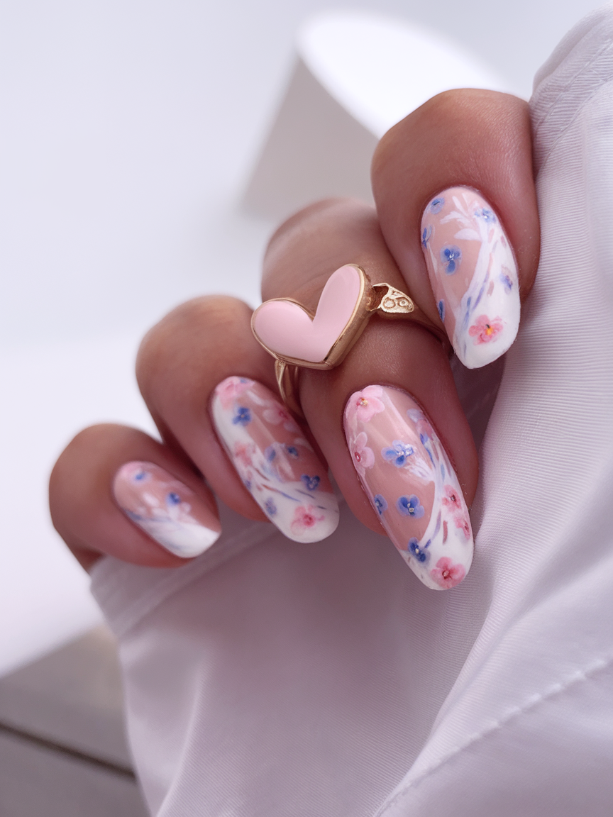 A dreamy ombre manicure blends soft pink and white with delicate floral details. The full design features blue and pink blossoms that create a light, airy effect, perfect for a romantic spring-summer look. A simple one yet artistic gel design that exudes femininity and grace.