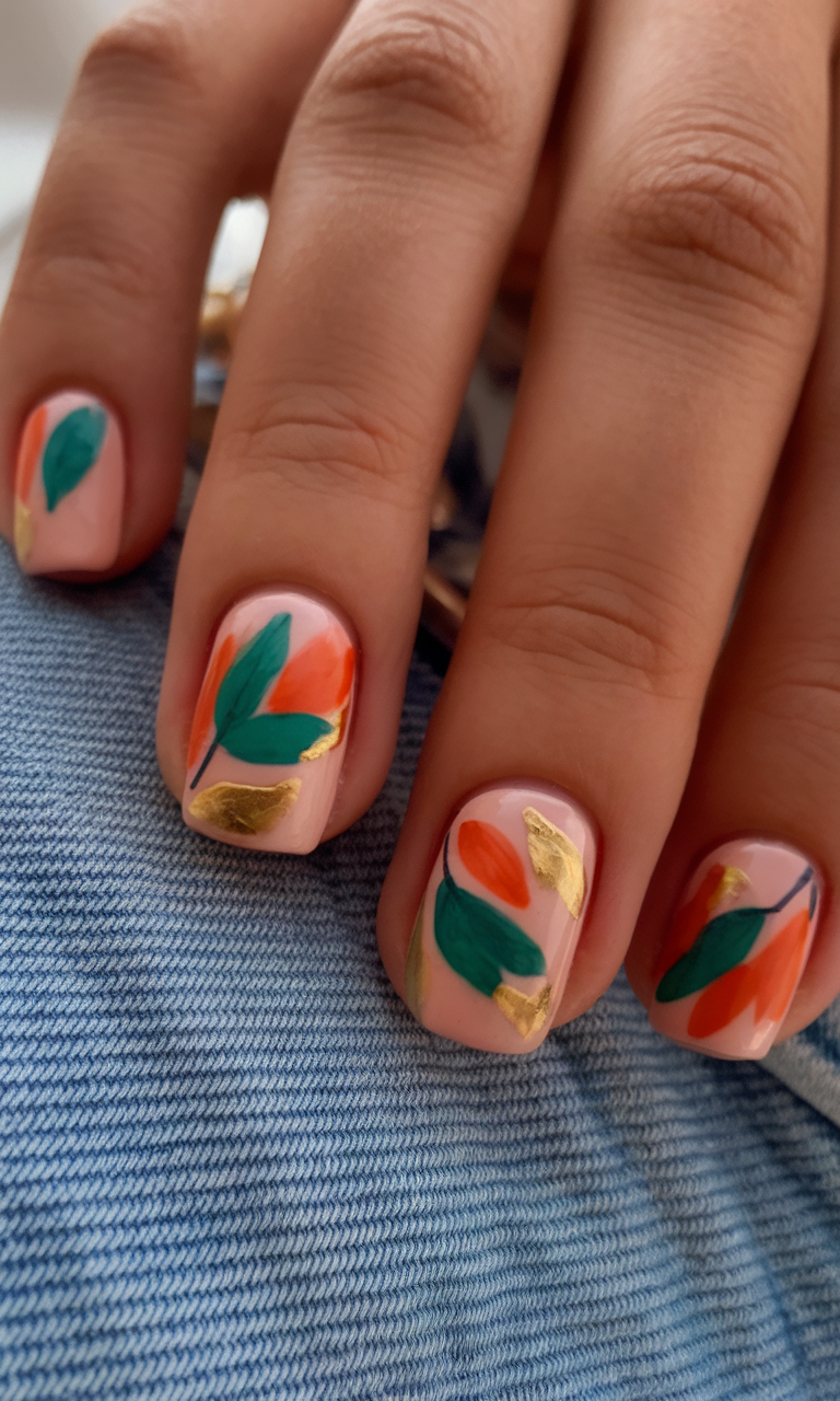 This multi-colored manicure combines a soft pink solid gel base with bold green and orange leaves. Gold foil details add an elegant touch, making this gel design perfect for a chic spring-summer look. The full artistic design stands out while maintaining a natural and modern aesthetic.