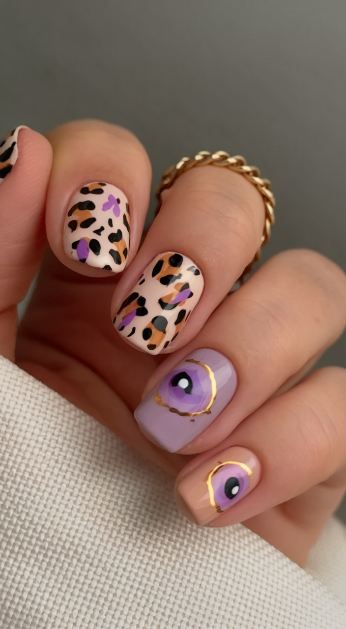 A fun and bold take on April nails color ideas 2025, this design features a mix of neutral leopard print and pastel evil eye accents. The solid gel purple complements the wild pattern, creating a striking contrast. This gel design is perfect for those who love edgy and artistic nails.