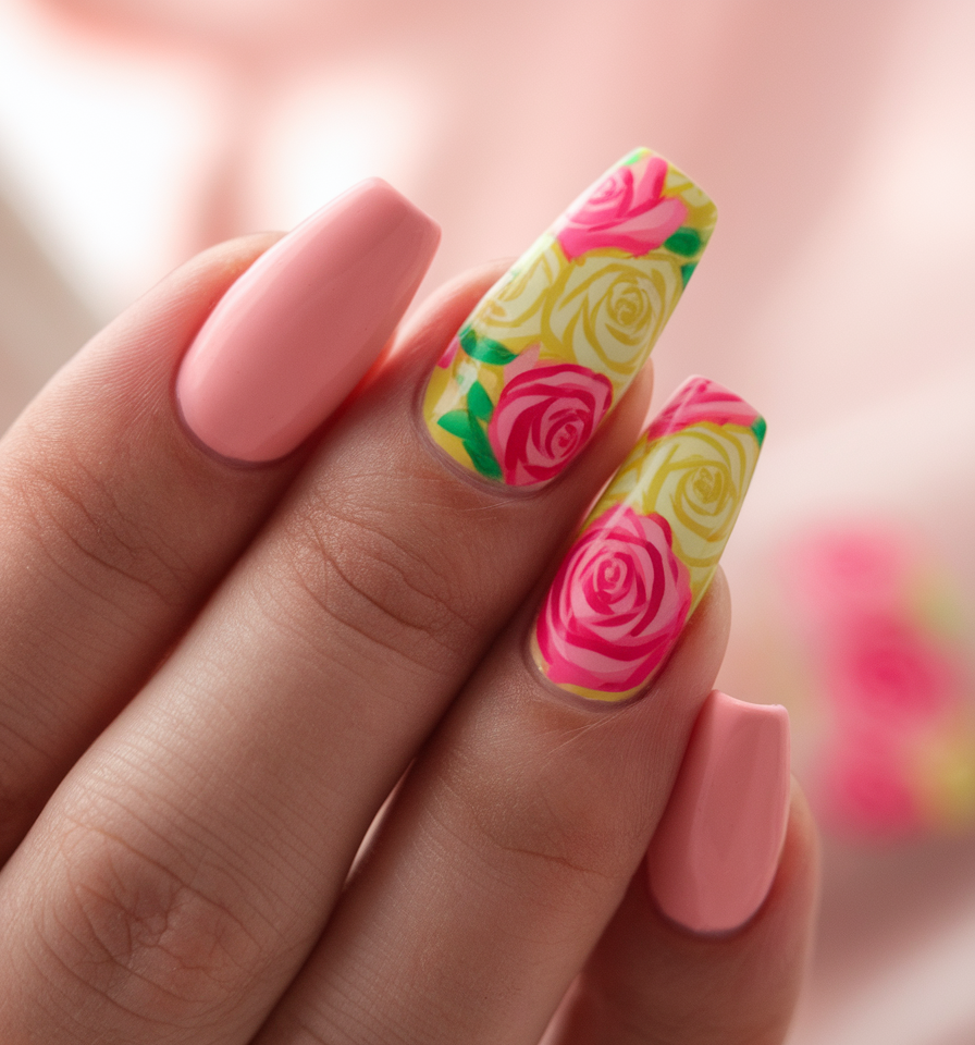 This dreamy ombre manicure combines neutral and multi-colored hues with intricate rose details. The blend of pastel pink and yellow creates a soft gradient, while the gel design ensures a flawless finish. A perfect choice for those who love a solid yet artistic look, this set is both elegant and trendy.