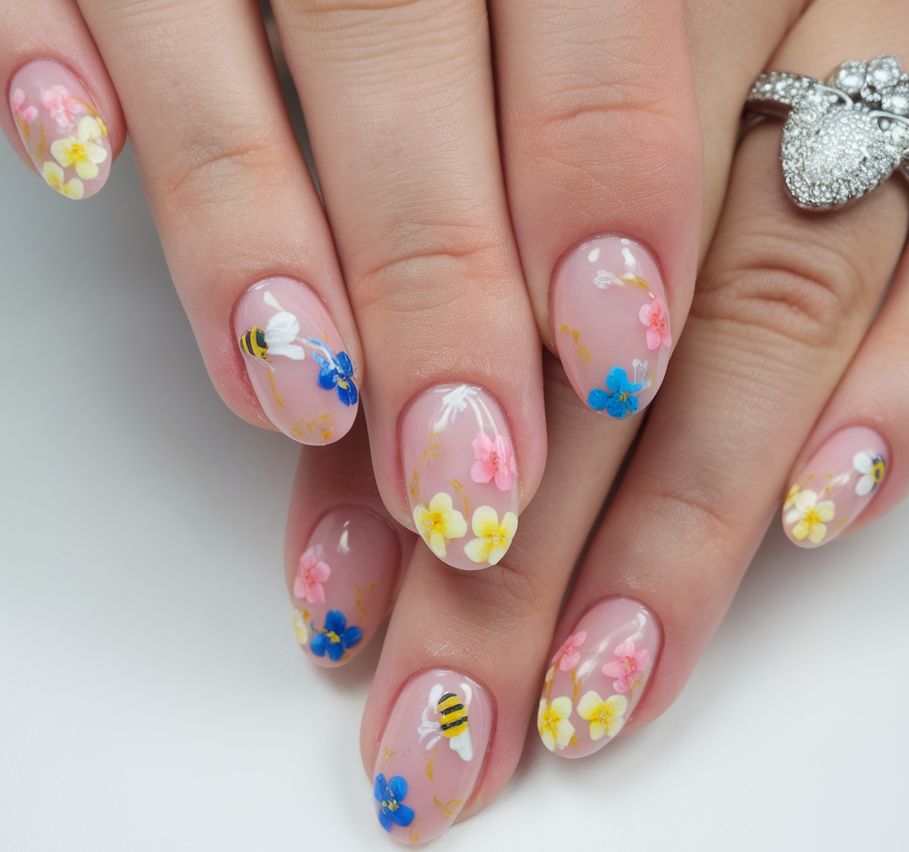 This spring-summer manicure features a light-colored base with hand-painted multi-colored flowers and intricate bee details. The gel design gives a natural and soft appearance, while the almond shape enhances its elegance. A perfect fun and simple choice for those who love floral-inspired nails with a touch of creativity.