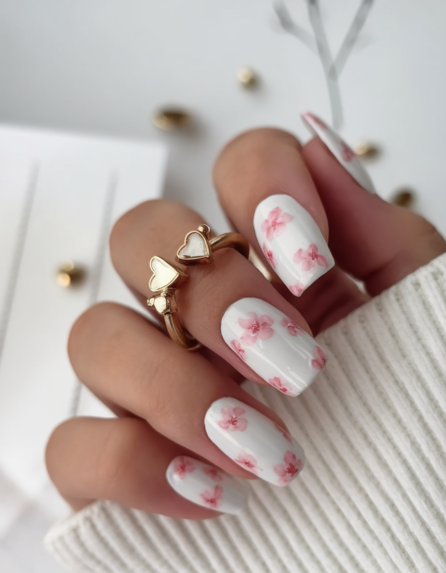 A fresh take on April nails color ideas 2025, this solid gel manicure combines a crisp white base with delicate pink blossoms. The full coverage and neutral tones make it a versatile option for both casual and elegant occasions. This simple one style is perfect for those who love a plain, yet refined floral design.