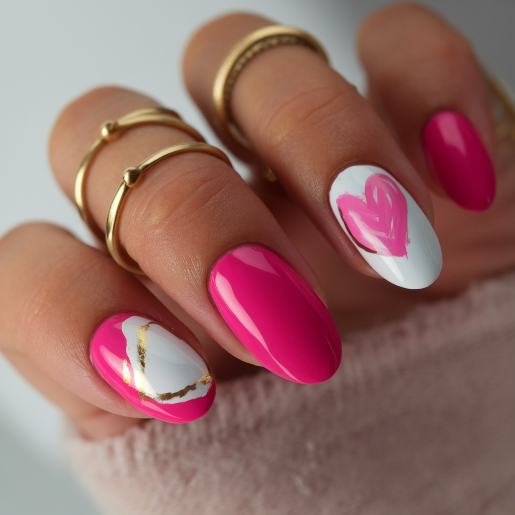 This bright and fun manicure pairs a solid hot pink with bold white accent nails for a striking contrast. A hand-drawn pink heart and metallic details add a trendy twist to the gel design. The almond shape enhances the sleekness of the nails, making it an ideal choice for a playful yet stylish look.