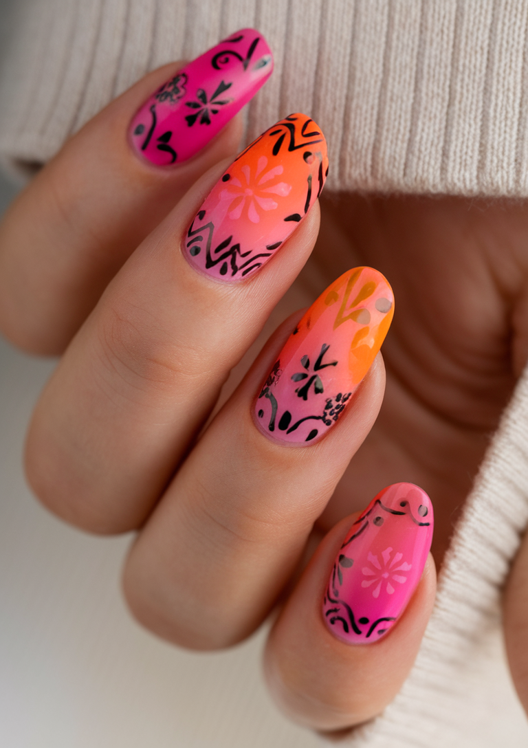 This bright and fun design blends pink and orange in a seamless ombre effect, creating a multi-colored look. Delicate black floral patterns add an artistic touch, making this gel design stand out. The almond shape enhances the elegance, making it a perfect choice for a spring-summer statement manicure.