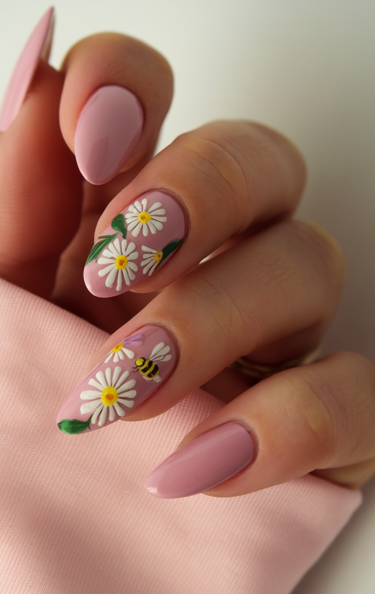 A simple and light-colored manicure featuring a solid gel pink base with intricate white daisy flowers. The hand-painted bee details add a charming touch, making this gel design ideal for nature lovers. This full floral set is perfect for a spring-summer look with a soft and feminine appeal.