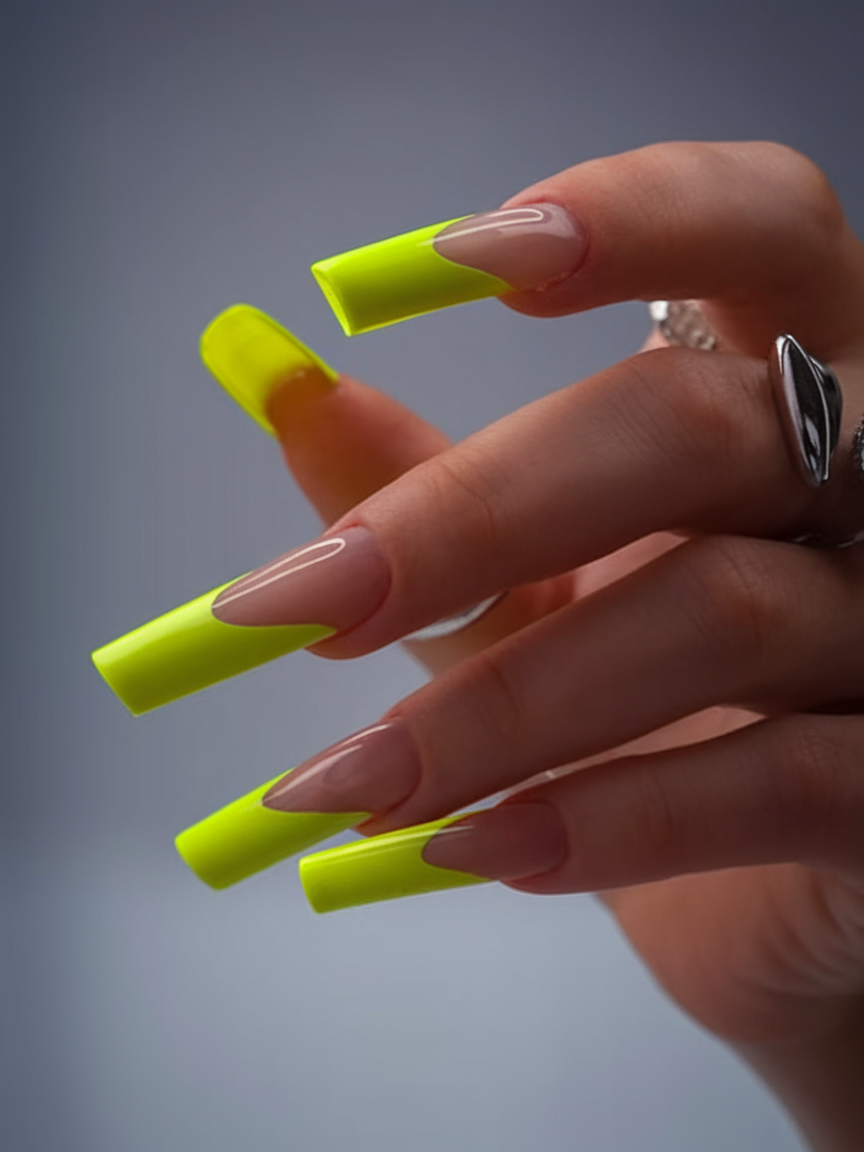 This fresh take on the French manicure pairs a simple, sheer glitter base with vibrant 2025 green neon tips. The modern design creates a chic contrast, making it a standout look for early spring. This 2025 dip style is perfect for those who love a balance between bold and classy. Pairing neon with a soft gel base ensures durability and a polished finish.