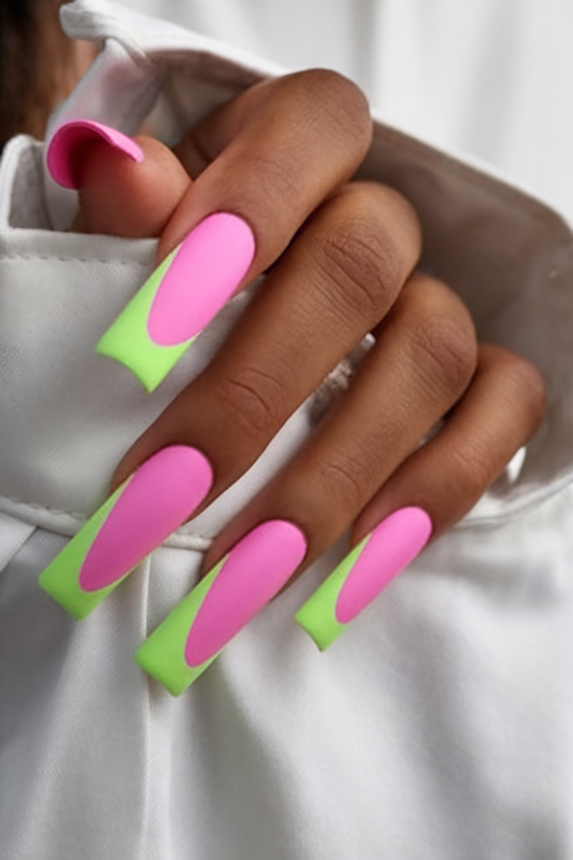 This bold matte nail design pairs a soft pink base with neon 2025 green French tips in a sleek, elongated shape. The crisp edges and curved details create a modern take on the classic French manicure. The dip powder technique ensures a smooth, durable finish, making this a popular choice for march nails color ideas 2025. Perfect for those who love a statement look with high-impact color.