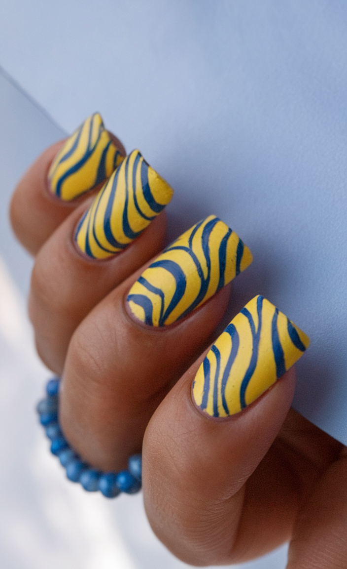 #16 Abstract Yellow and Blue Zebra Print Nails