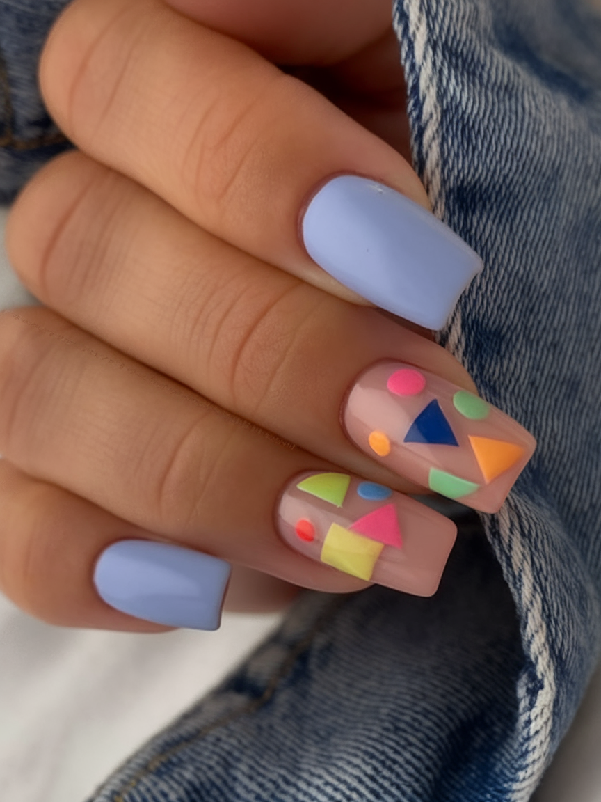 This simple yet creative nail design combines soft pastel blue with bold neon geometric accents. The glossy 2025 OPI finish enhances the contrast between the subtle base and the colorful shapes. The short nail length makes this a wearable 2025 dip manicure for everyday styling. A great choice for those looking for a mix of minimalist and artistic ideas 2025.