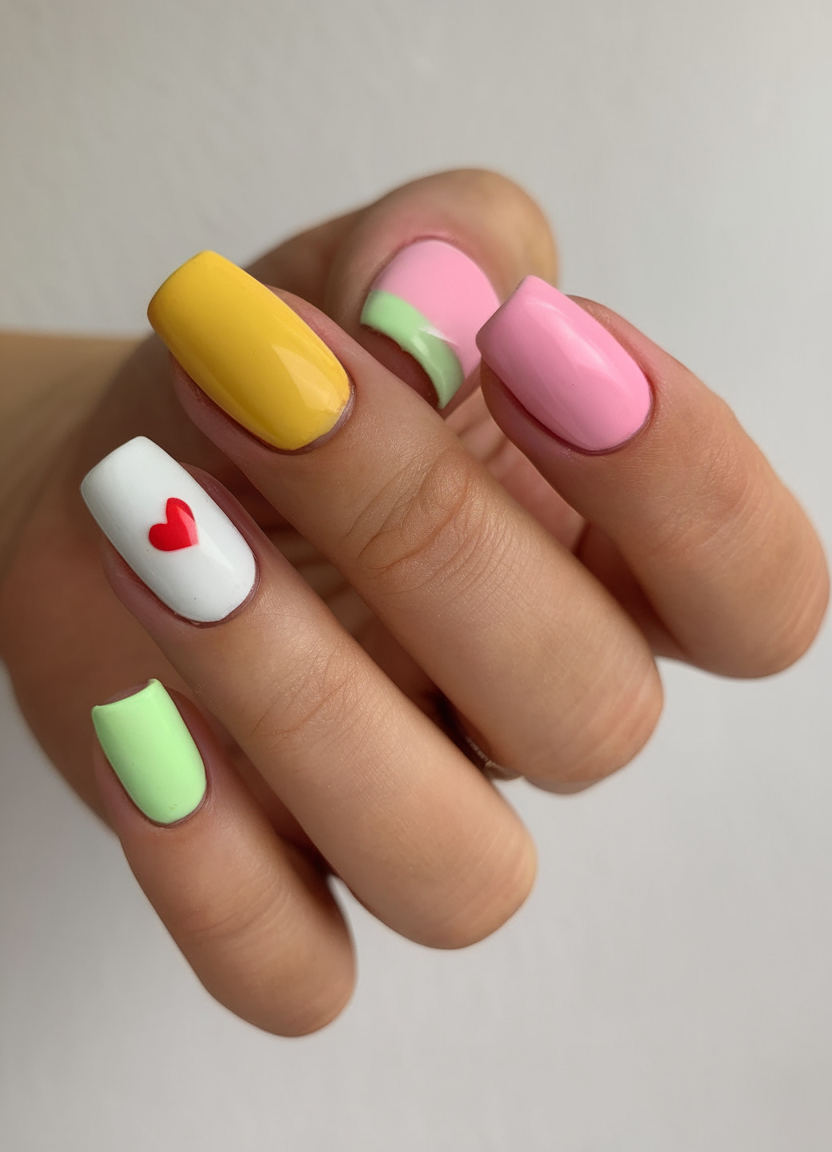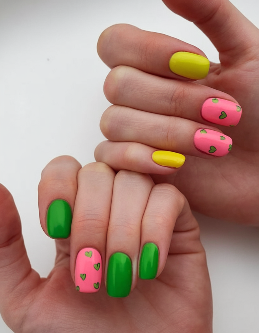 This cute and vibrant nail design features a mix of 2025 green, yellow, and pink shades. The pink nails are decorated with tiny hand-painted green hearts, adding a fun and romantic touch. The glossy gel finish ensures a sleek and polished look, making it a great choice for March nails color ideas 2025. This mix-and-match style is perfect for those looking for creative ideas 2025.