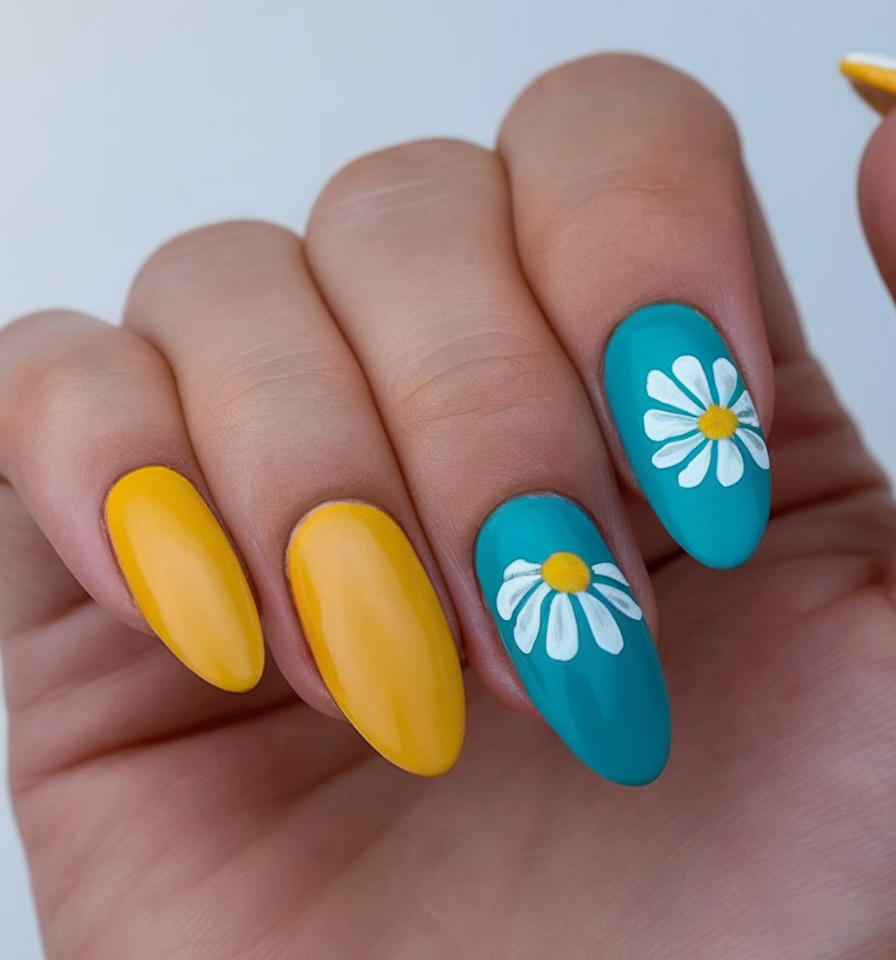 This popular manicure combines bold blue and yellow nails with delicate hand-painted white daisy designs. The almond shape enhances the elegance of the floral artwork, giving it a fresh 2025 OPI-inspired look. The high-gloss gel finish makes the colors stand out while maintaining a smooth, polished effect. This 2025 dip manicure is a stylish option for early spring.