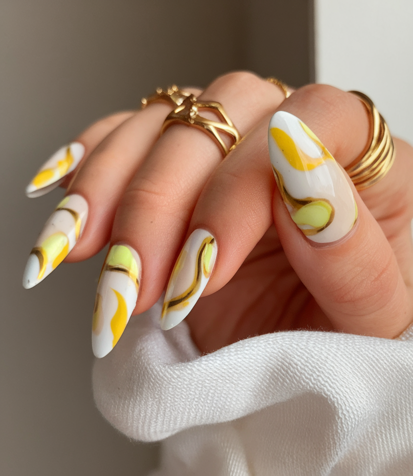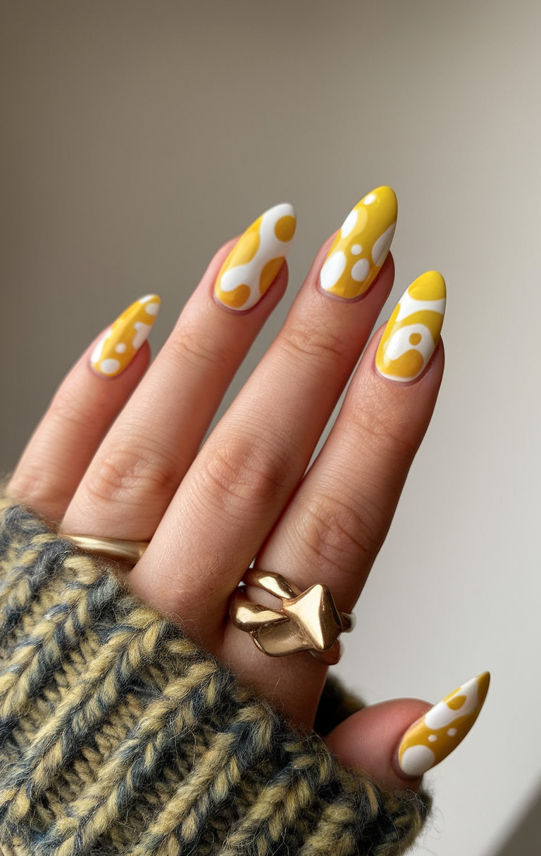 This modern almond-shaped manicure combines a bright yellow base with bold white abstract details. The glossy gel finish enhances the smooth curves and organic patterns, making it a trendy option for march nails color ideas 2025. The simple yet artistic design is perfect for those looking for fresh ideas 2025. This look is both fun and stylish, ideal for February and early spring.