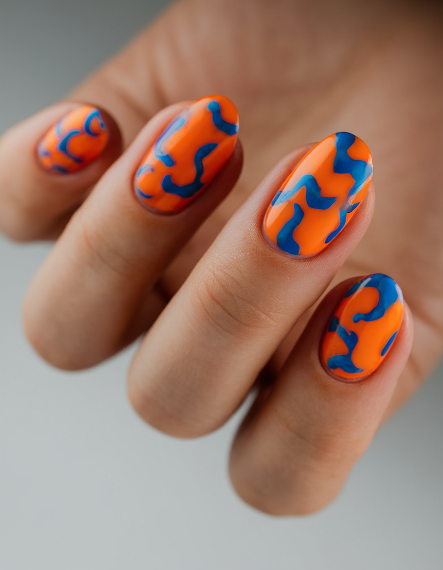 Bold and artistic, this 2025 OPI-inspired design features a mix of bright orange with abstract blue accents. The free-flowing patterns create a dynamic effect, perfect for those looking for creative ideas 2025. This dnd-style look works well with both short and almond nail shapes. Whether you choose 2025 gel or dip powder, this manicure makes a statement.