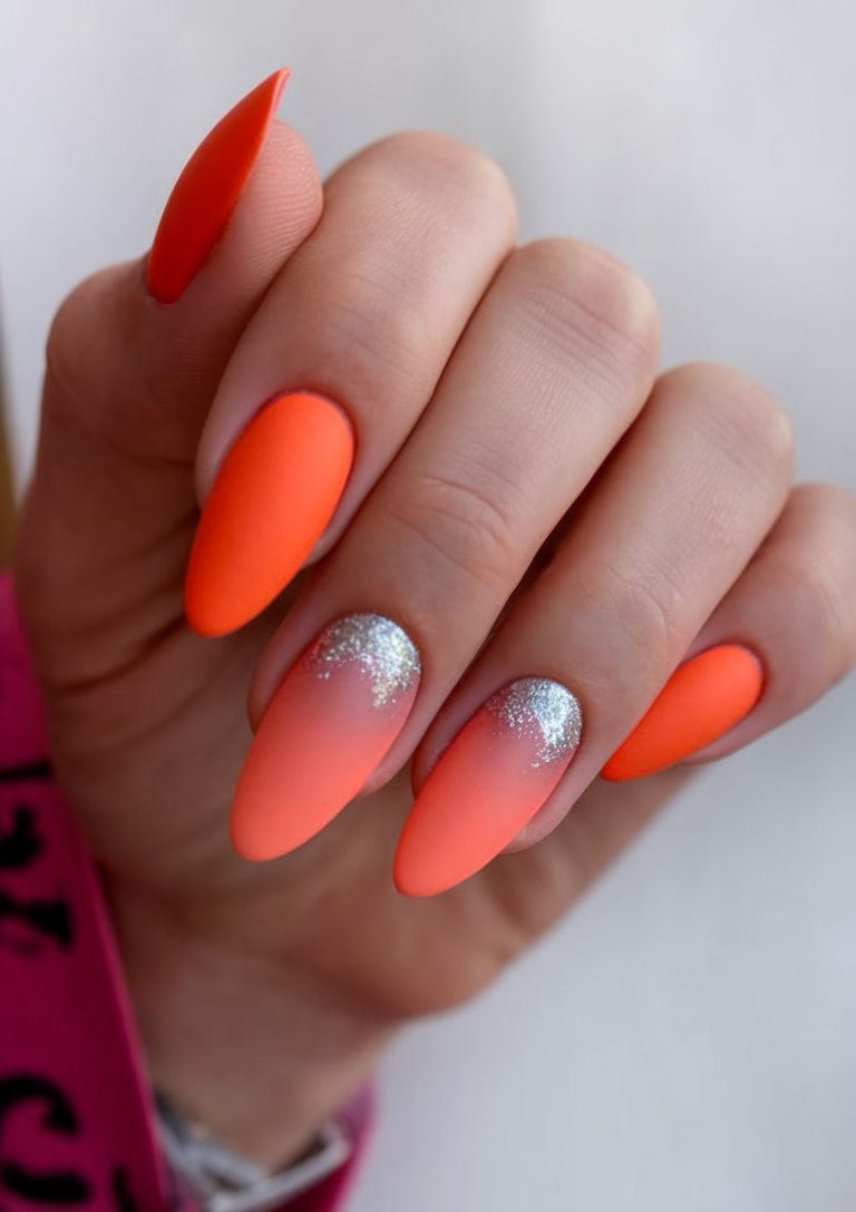 A striking almond-shaped manicure featuring a vibrant orange ombré fade, finished with a soft matte effect. The silver glitter details near the cuticles add an extra touch of sparkle, making this 2025 dip look stand out. The dip powder technique ensures a long-lasting and smooth gradient transition. This bold and cute style is a great choice for early spring and February manicures.