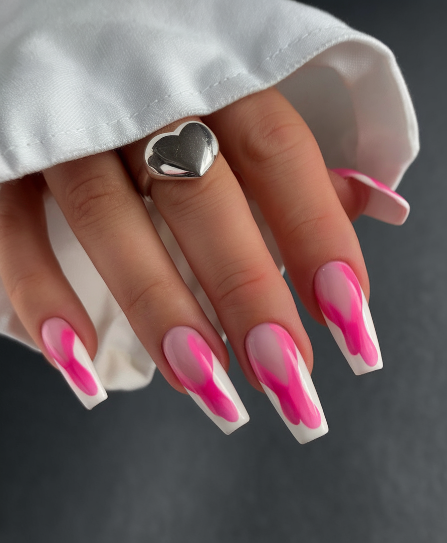 This simple yet artistic 2025 OPI design reinvents the French manicure with fluid pink abstract patterns over a glossy white base. The gel finish adds a sleek touch, making the colors appear even more vibrant. The elongated coffin shape enhances the modern aesthetic, making this a popular option for ideas 2025. This elegant yet playful look is perfect for those who love a creative twist on classic styles.
