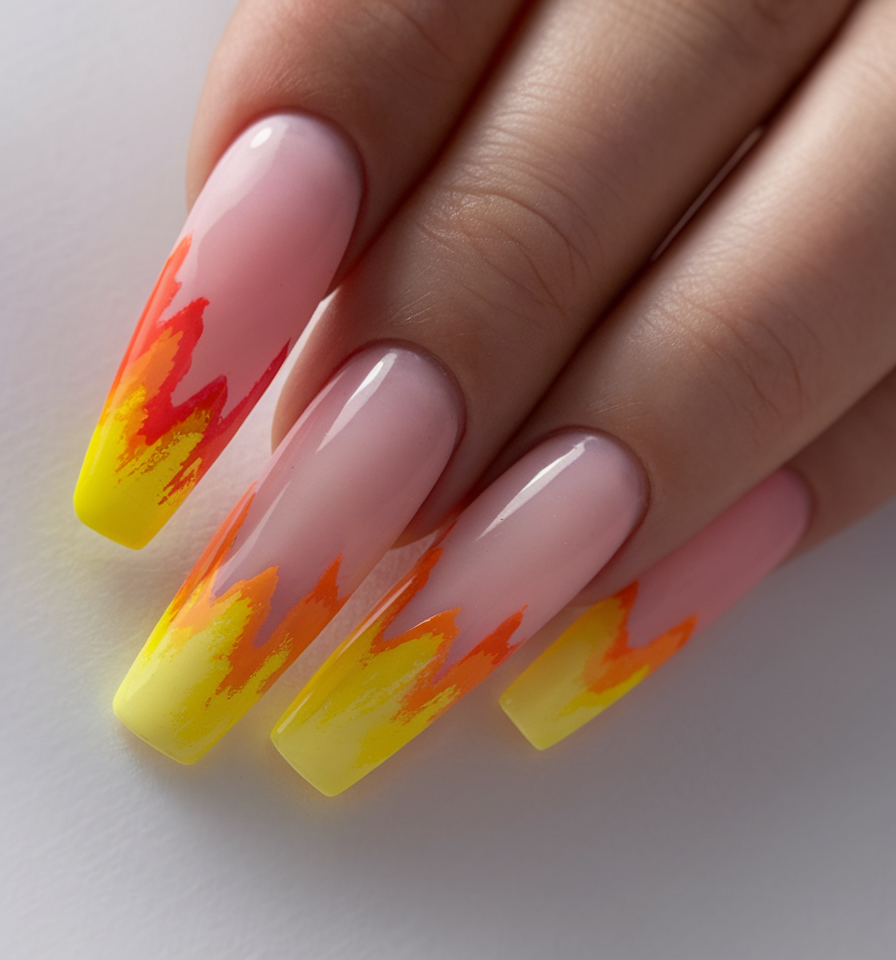 This bold manicure features a clear pink base transitioning into a fiery ombré of yellow, orange, and red. The glossy 2025 gel finish enhances the flame-like design, making it a popular choice for March nails color ideas 2025. The coffin shape adds to the dramatic effect, making this a standout ideas 2025 look for those who love statement nails.