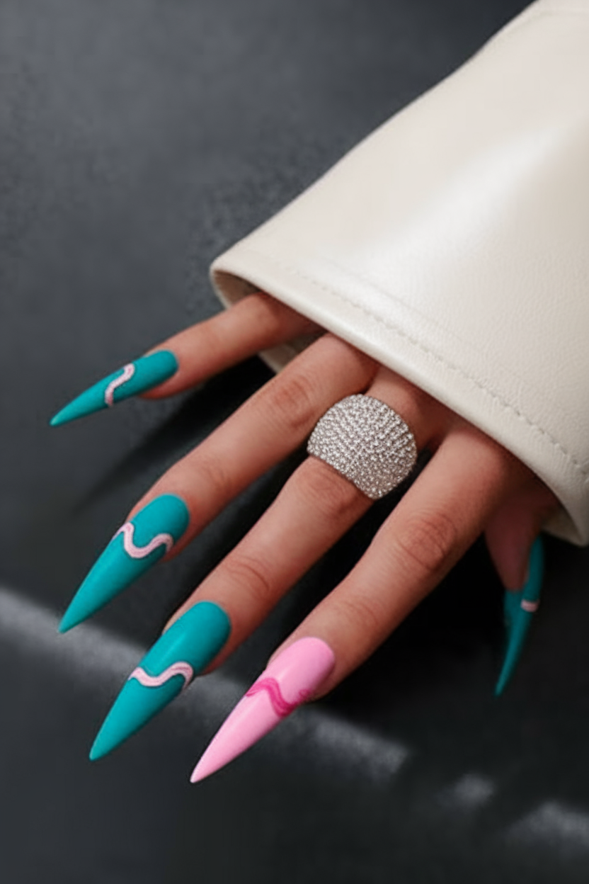 This 2025 dip manicure combines deep teal and pastel pink shades with delicate wavy line details. The stiletto shape elongates the fingers, adding elegance to the modern dnd-inspired design. The matte finish gives a soft, velvety look, making it perfect for early spring. This is a great option for those looking for simple yet stylish ideas 2025.