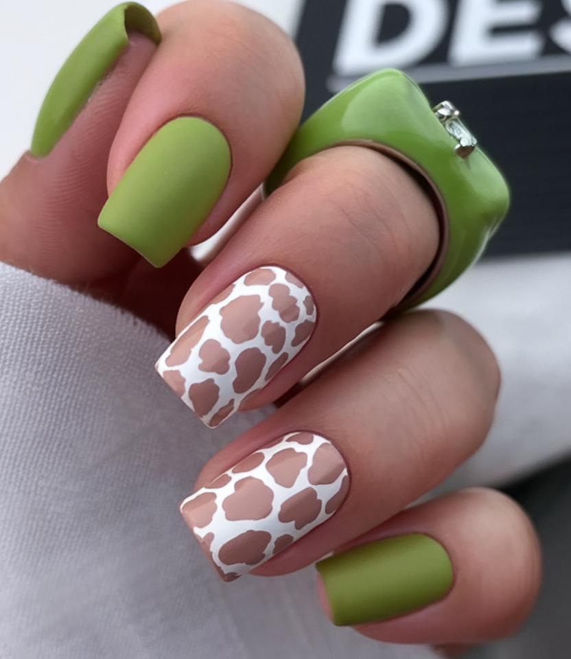 A mix of 2025 green matte nails and cow print accents creates a fun yet sophisticated look. The short, square shape keeps it simple, while the detailed white and beige pattern adds a playful touch. The dip powder technique ensures a smooth and even application, making it a popular choice for March nails color ideas 2025. This unique combination blends cute and trendy styles effortlessly.