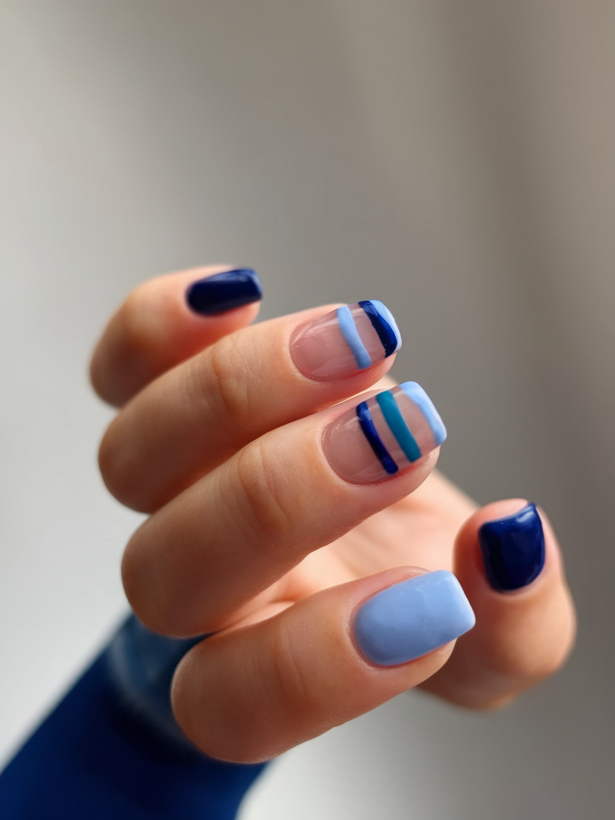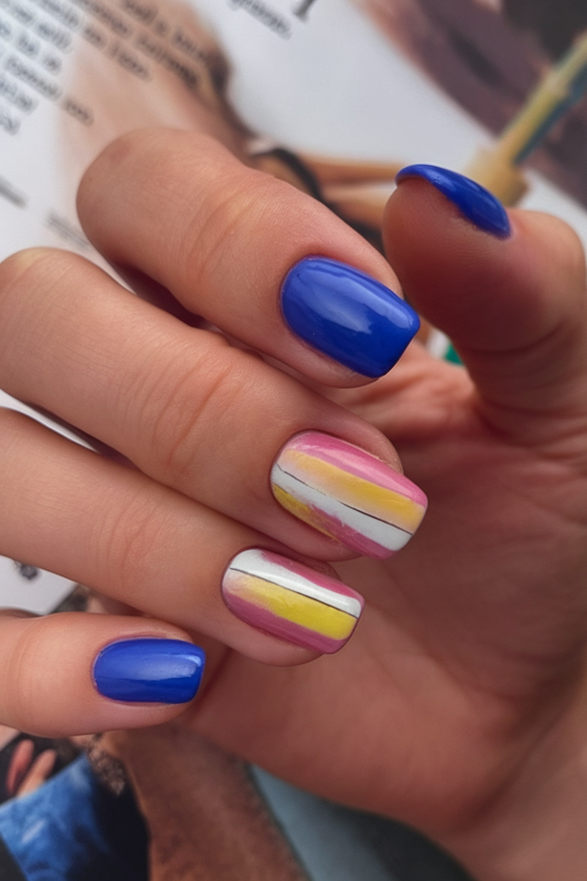 This short, square-shaped manicure combines vibrant royal blue with soft pastel stripes in pink, yellow, and white. The glossy 2025 gel finish enhances the contrast between the bold and delicate elements. The abstract stripe design adds a creative touch, making this a popular choice for March nails color ideas 2025. This look is great for those seeking simple yet artistic ideas 2025.