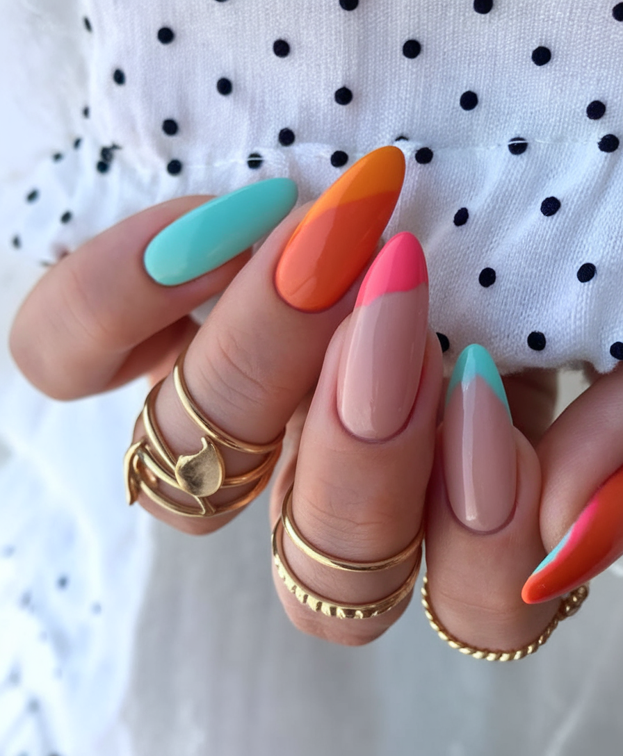 This 2025 gel manicure reinvents the French tip with bold color-blocked accents in orange, pink, and turquoise. The almond shape adds elegance, while the glossy finish enhances the vibrancy of each shade. The asymmetrical design gives this look a modern and popular appeal for March nails color ideas 2025. Perfect for those seeking ideas 2025 that balance playful and chic styles.